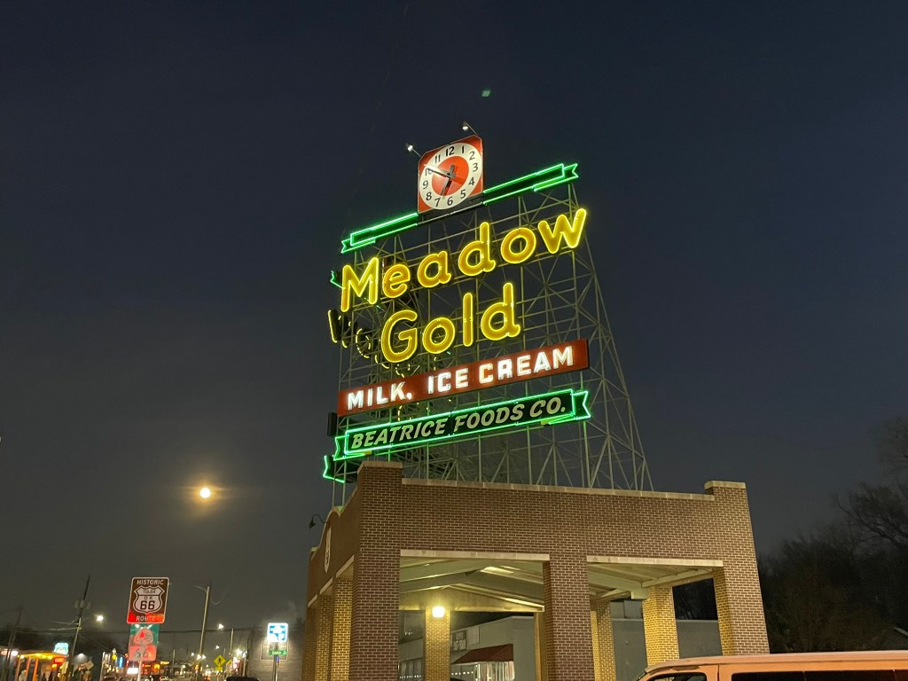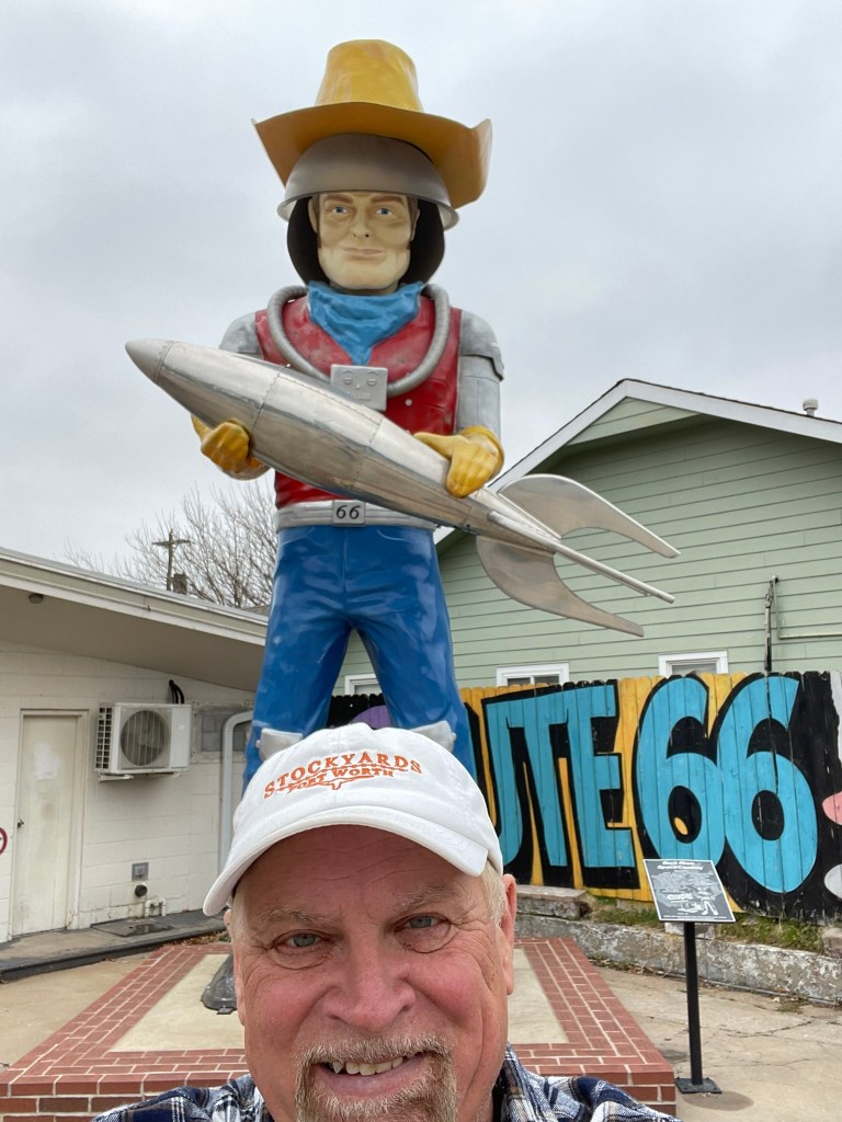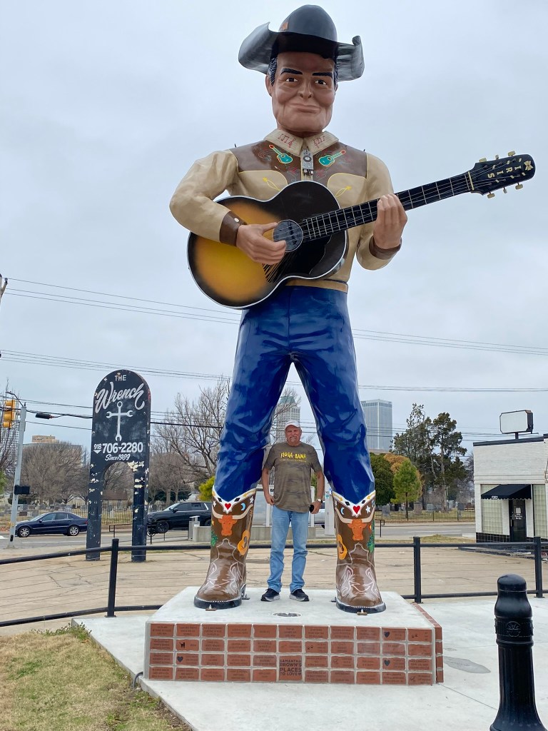 East meets west statue on route 66 in OK city. in front of portion of original route 66